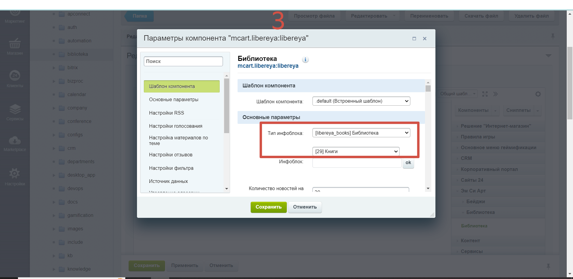 6. Укажите тип инфоблока — «Библиотека», инфоблок «Книги», нажмите на кнопку «Ок» (см. скриншот 3).