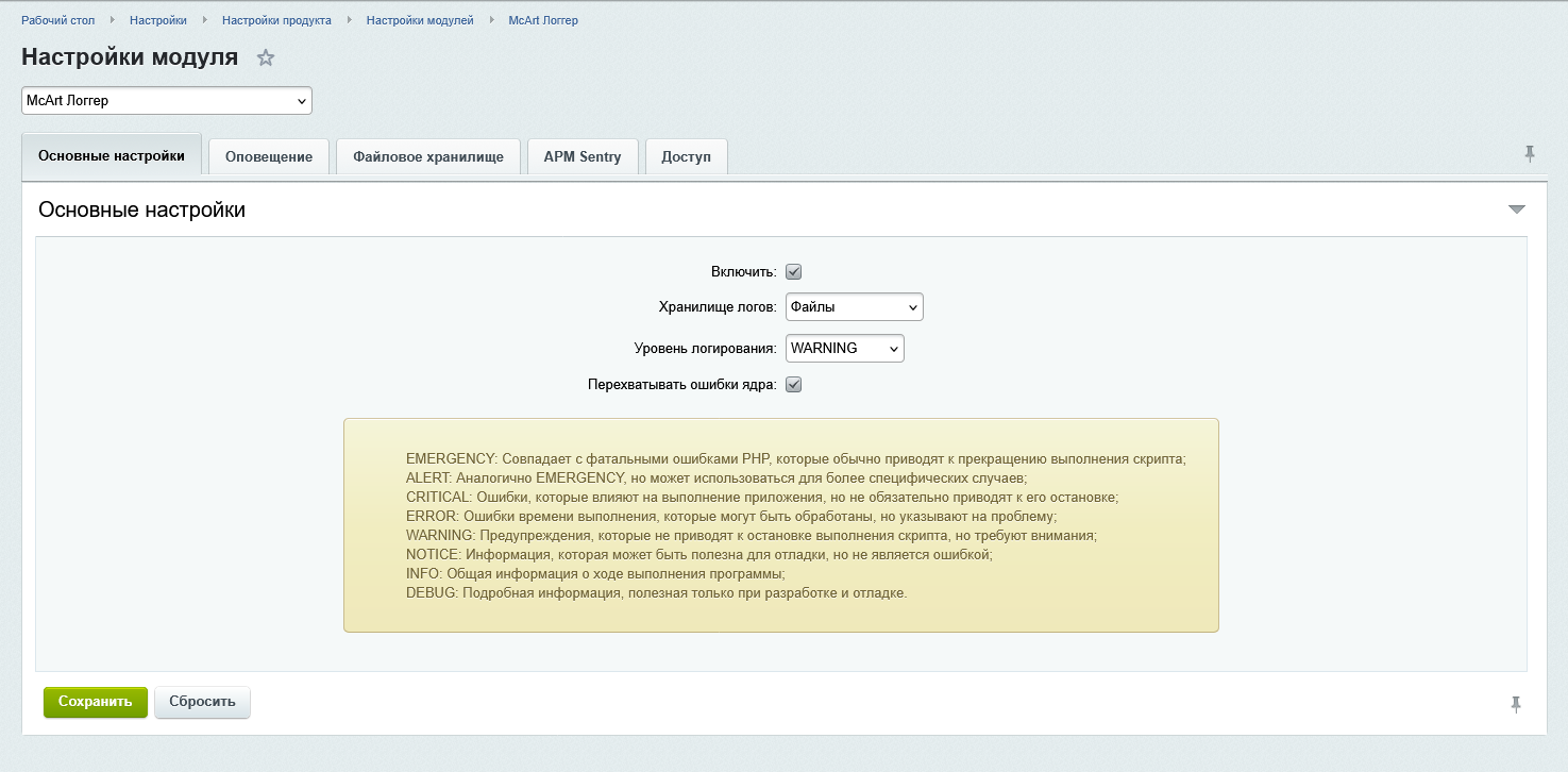 Модуль mcart.logger предоставляет универсальный инструмент для централизованного логирования событий приложения. Он поддерживает уровни логирования от debug до emergency, соответствующие стандарту (psr-3). Модуль также включает функционал для перехвата ошибок ядра Bitrix, что позволяет агрегировать все логи в одном месте с возможностью гибкой настройки.