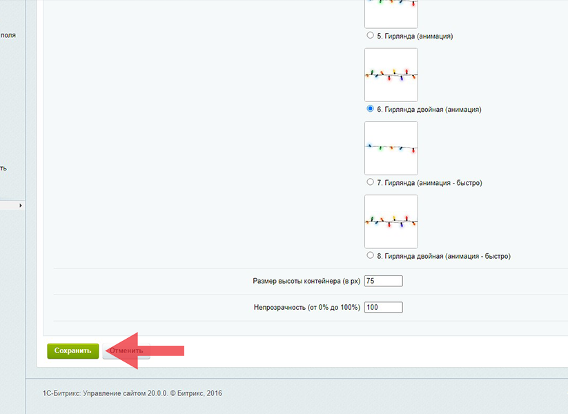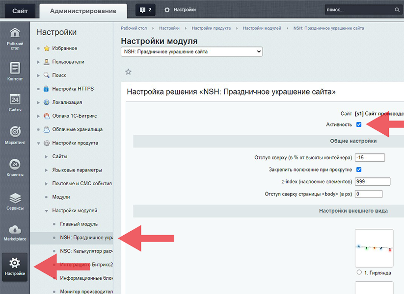 Настройки -> Настройки продукта -> Настройки модулей -> NSH: Праздничное украшение сайта