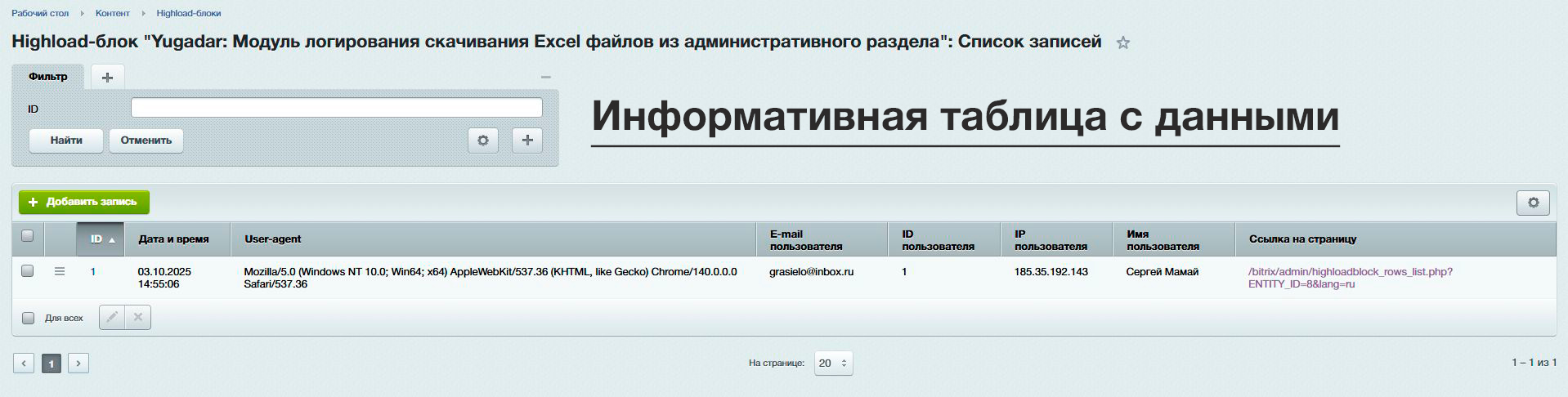 Найдите в списке модуль «Yugadar: Логирование экспорта в Excel из административного раздела».