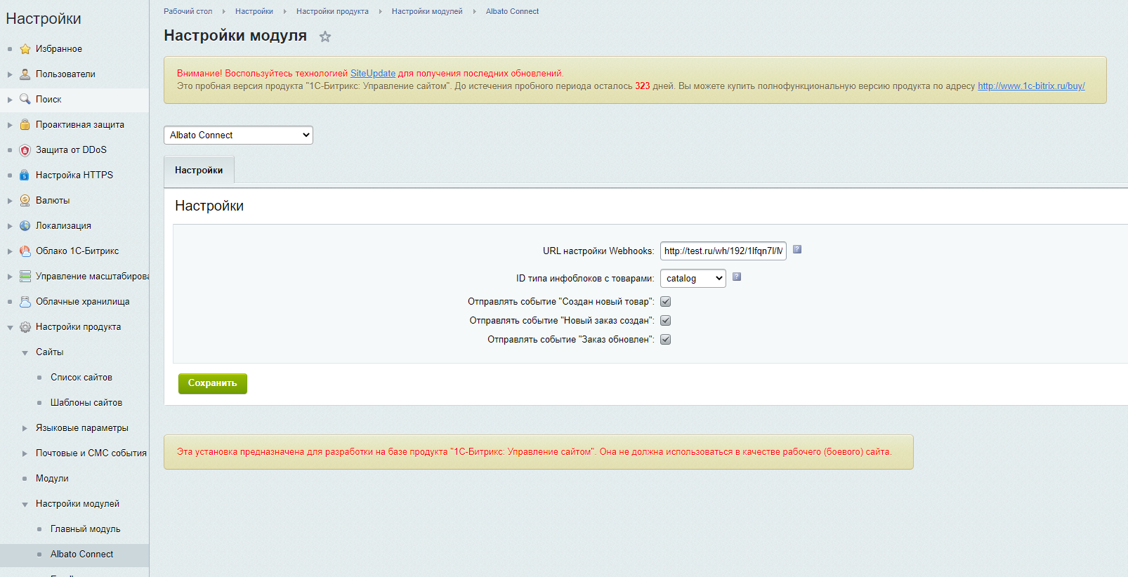 Для корректного отправления данных в Альбато необходимо установить в настройках модуля albato.connect "URL настройки Webhooks". Этот параметр необходимо получить при создании подключения 1С:Битрикс в Альбато, вкладка "Доступ". Также необходимо выбрать тип инфоблоков с товарами и выбрать тип событий для отправки.