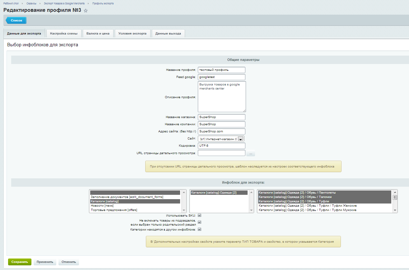 ВНИМАНИЕ! При изменении настроек «Инфоблок для экспорта», «Использовать SKU» - данные на вкладке «Условия экспорта», «Настройка схемы» сбрасываются!
