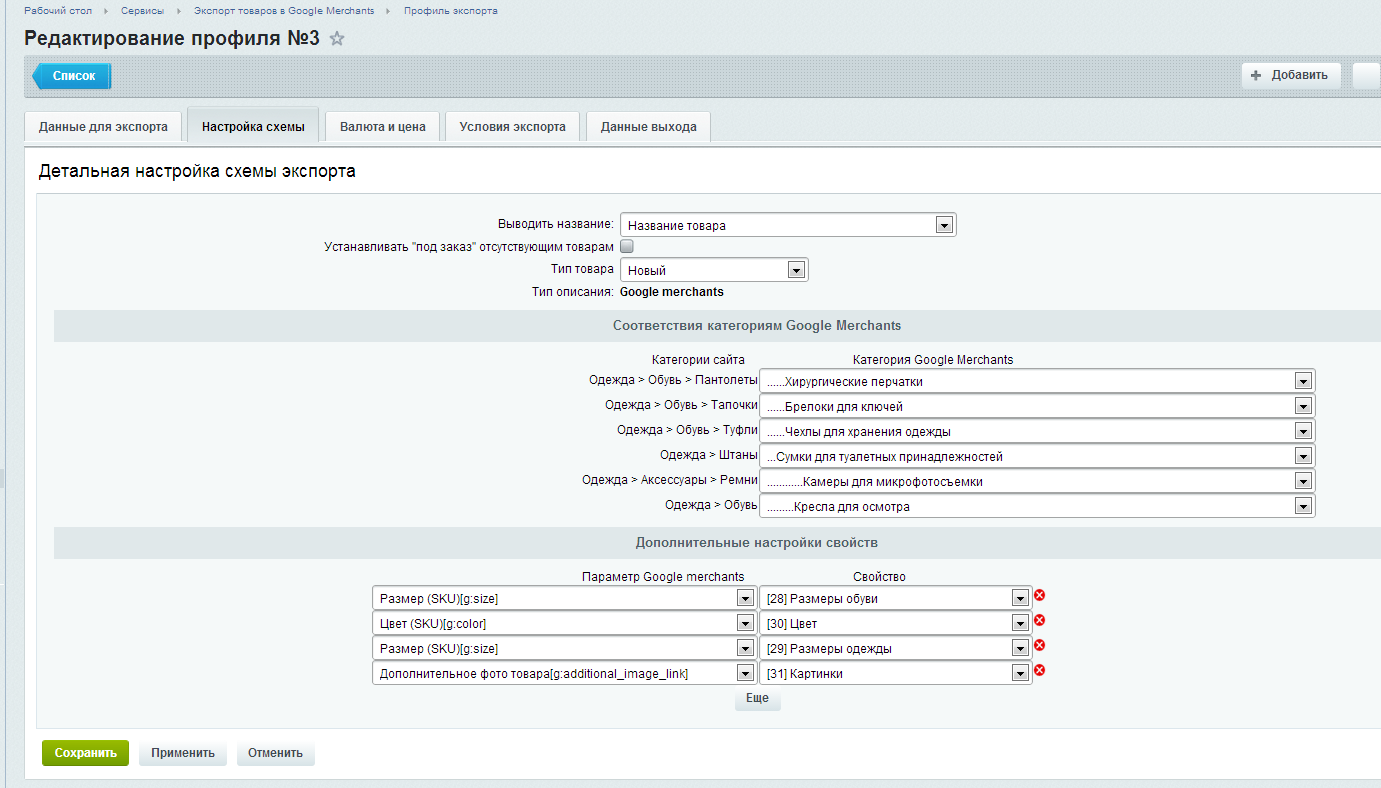 Настройка профиля выгрузки производится в Разделе Сервис >Экспорт товаров в Google Merchants > Профиль Выгрузки.