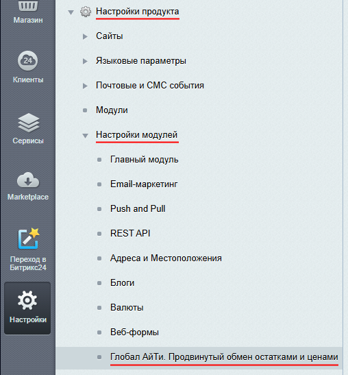 | Настройки -> Настройки продукта -> Настройки модулей -> Глобал АйТи. Продвинутый обмен остатками и ценами |