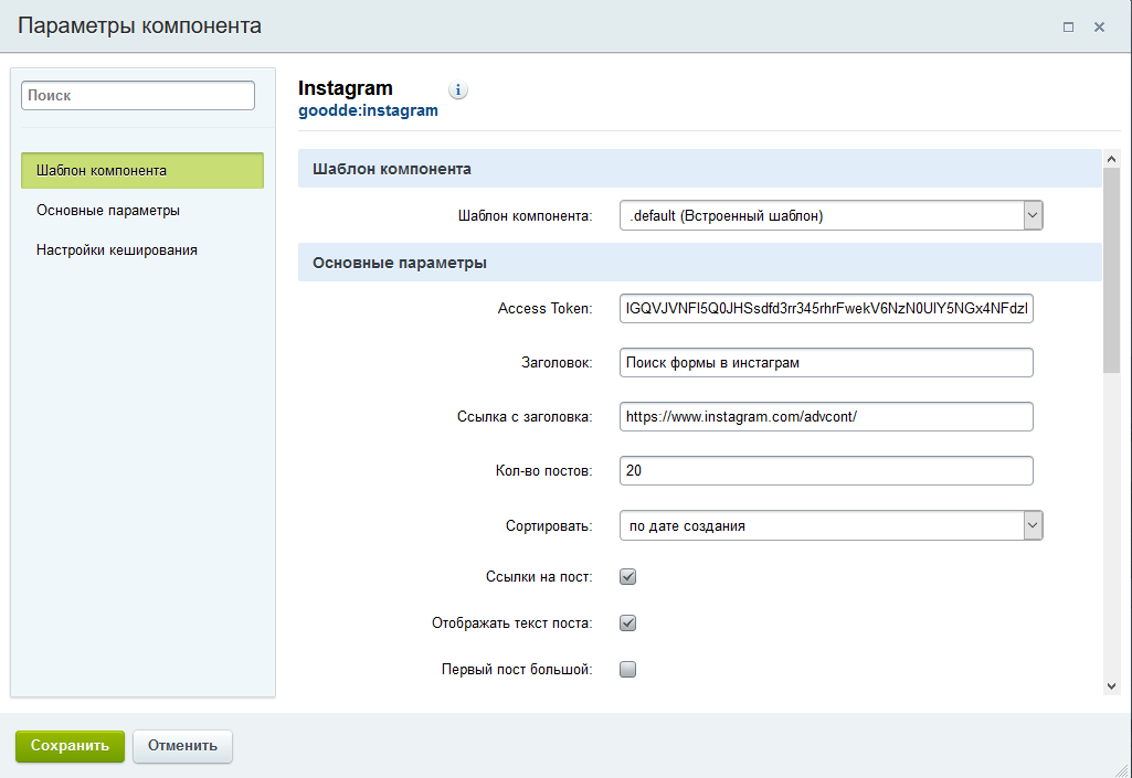 После установки модуля будет доступен компонент goodde.instagram* (в визуальном редакторе 'Хороший Дизайн' -> 'Instagram*'). Компонент выгружает посты из instagram* в созданный при установке инфоблок goodde.instagram*.Максимальное значение параметра 'Количество постов' - 20.