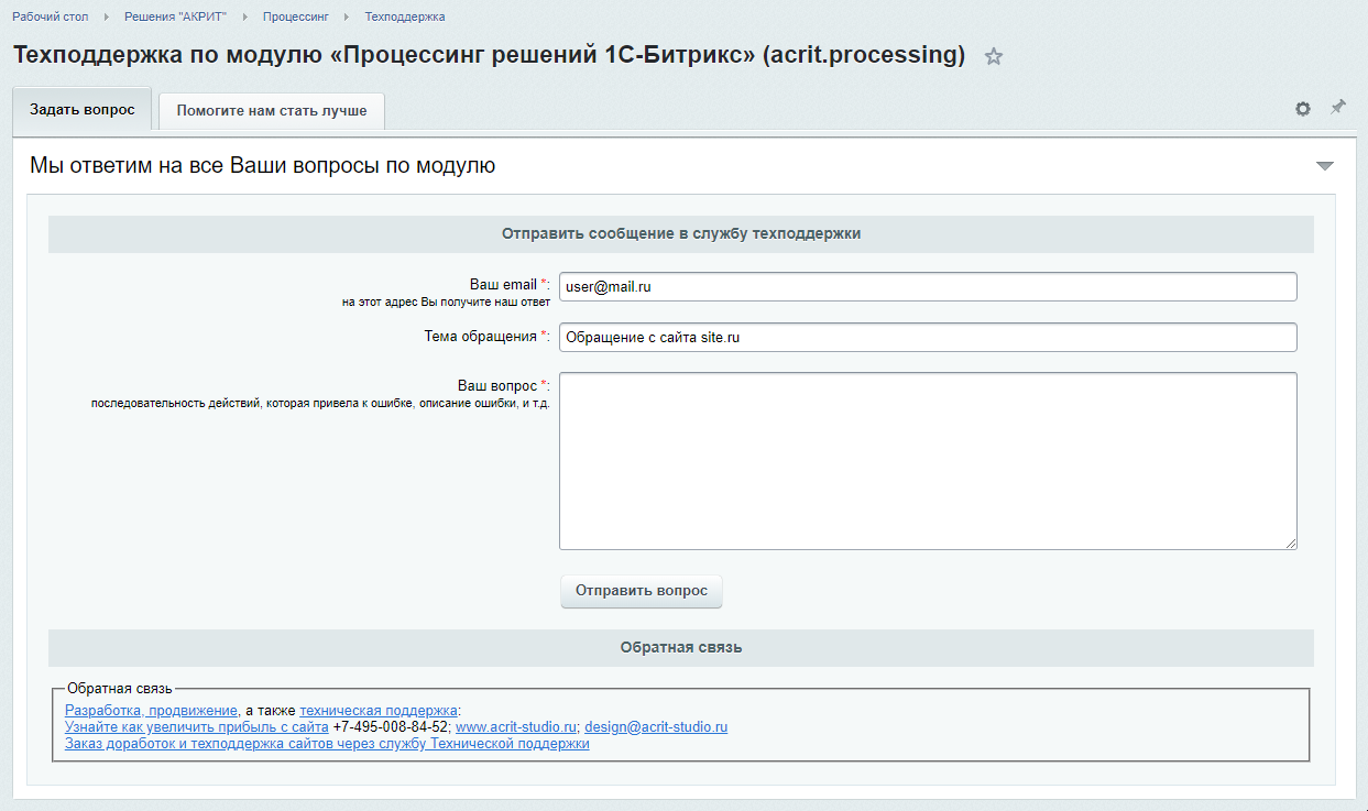 - Через форму на вкладке Техподдержка интерфейса модуля.