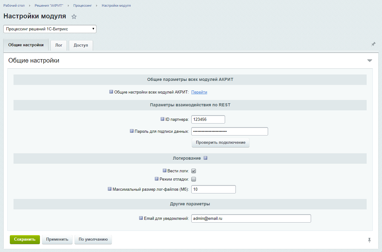 Настройки модуля – быстрый переход на стандартную страницу настроек модуля, где, помимо прочего, необходимо установить данные для подключения к REST: ID партнера и пароль для подписи данных,