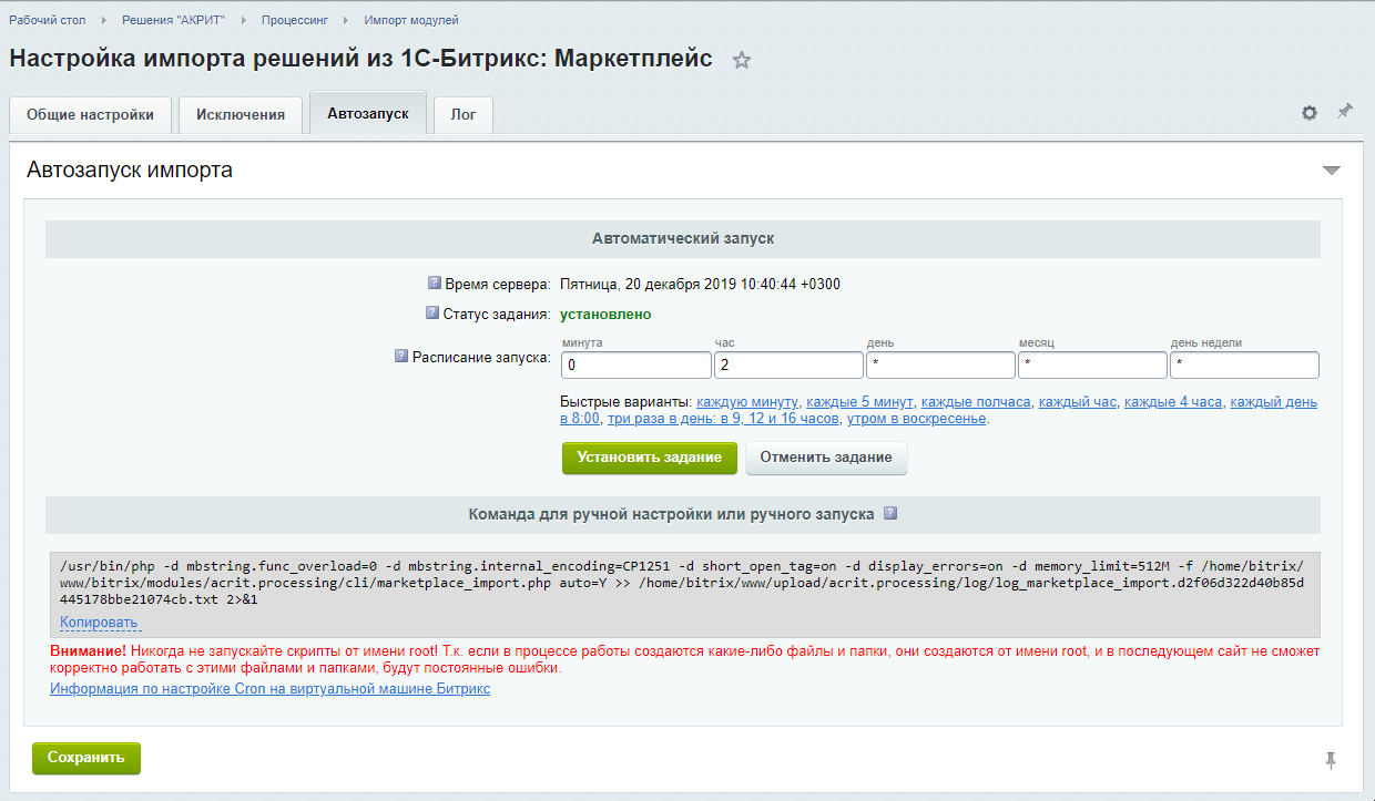 на вкладке Автозапуск установить врем автоматического запуска импорта (этот функционал работает не на всех серверах, в среднем это работает более чем в 9 из 10 случаев), или же можно вручную запустить или вручную настроить планировщик – для этого ниже приведена Команда для ручной настройки или ручного запуска.