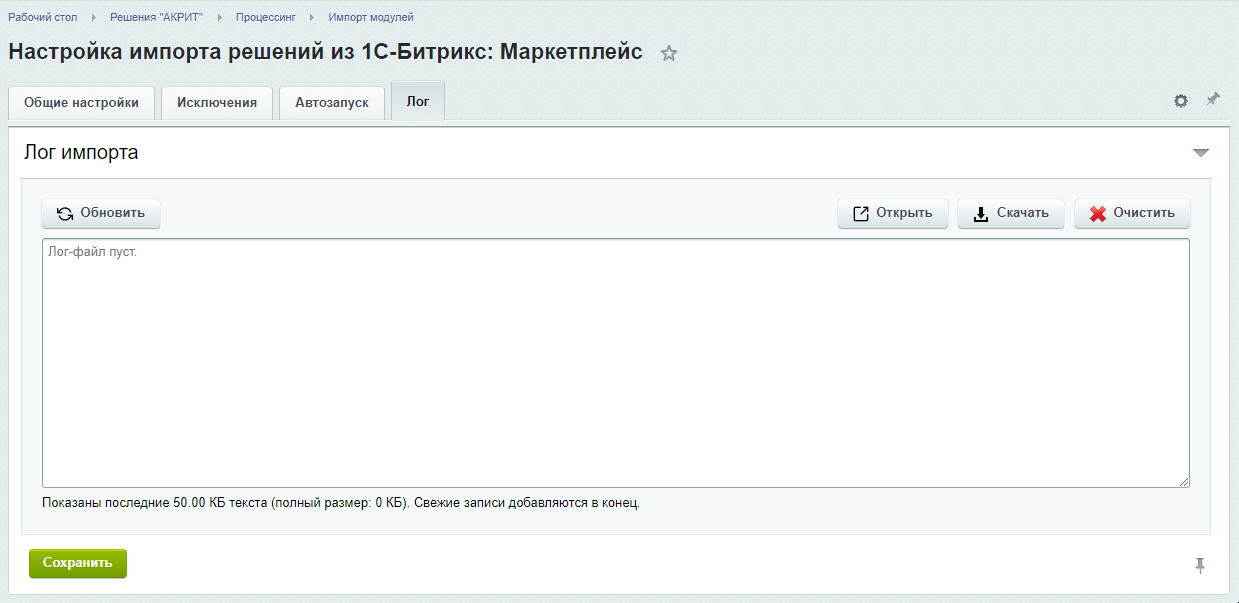 установить галочку Тестовый режим, и указать один конкретный модуль (например, acrit.export) в поле Модуль для тестирования – чтобы протестировать загрузку на примере одного модуля,