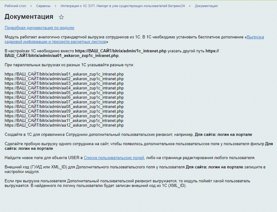 Модуль Интеграция c 1С ЗУП. Импорт в уже существующих пользователей Битрикс24 /bitrix/admin/aa01_askaron_zup1c_intranet.php
