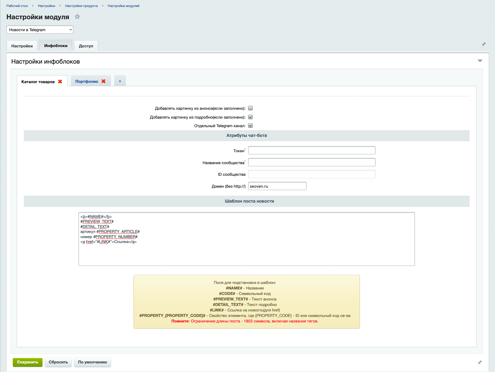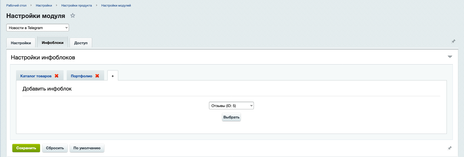 - настраивать разные Телеграмм каналы для разных инфоблоков