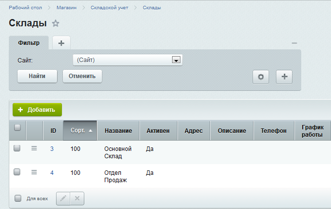 Список складов создается автоматически на основании данных из 1С:Предприятие 7.7.