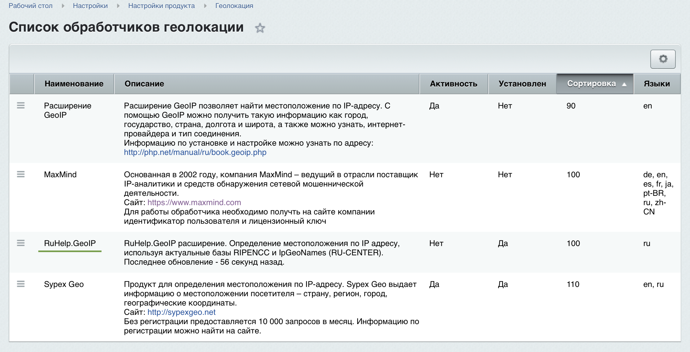 В настройках продукта на странице "Геолокация" в списке обработчиков появляется обработчик "RuHelp.GeoIP", который может быть добавлен для получения данных.