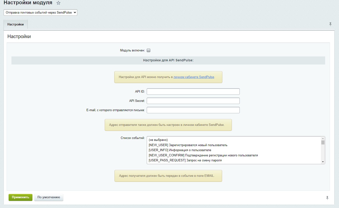 После установки модуля в настройках требуется указать данные для API (ID и Secret), которые можно получить в личном кабинете SendPulse. Также в личном кабинете необходимо настроить E-mail отправителя, а затем указать его в настройках модуля.