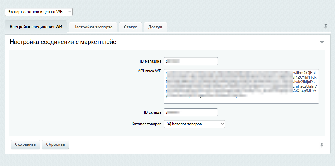 5. Укажите API ключ и номер склада, инфоблок с товарами. Сохраните. Выберите свойства с ID товара и штрихкодом. Настройте выгрузку цены и остатков.