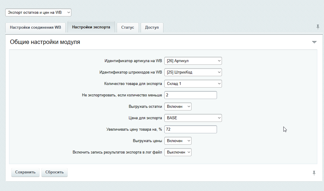 Модуль позволяет автоматически обновить через API цены и остатки на Wildberries.