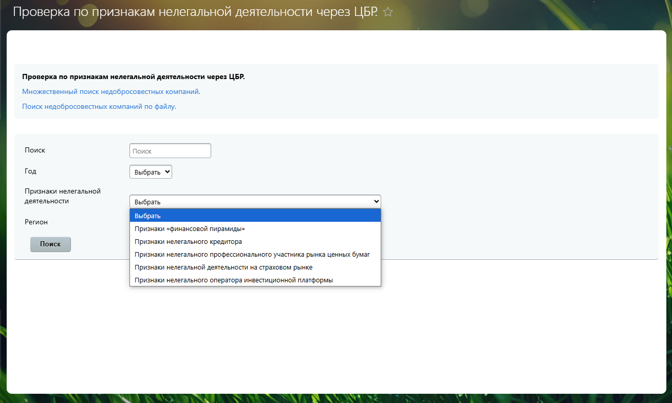 Модуль предназначен для ручной контрагентов на наличие признаков нелегальной деятельности на основе данных Центрального Банка России.