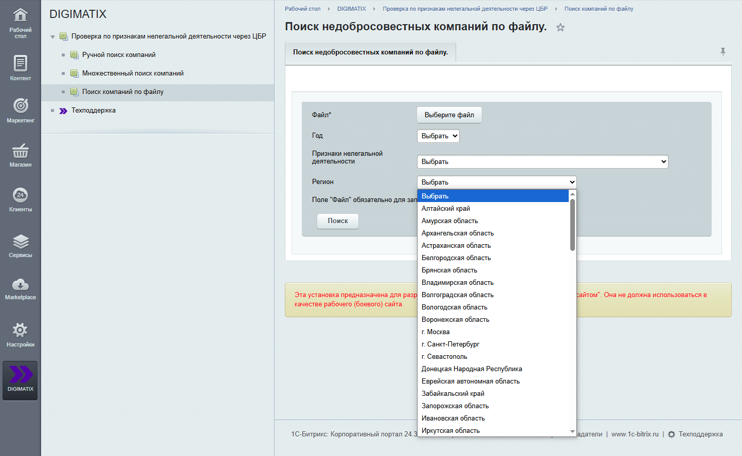 В административной части сайта реализован отдельный раздел с тремя видами поиска. Также в состав модуля входит публичный компонент digimatix:cbrblacklist который можно разместить в публичной части проекта и осуществлять поиск компаний.Компонент и модуль работает на любой редакции БУС.