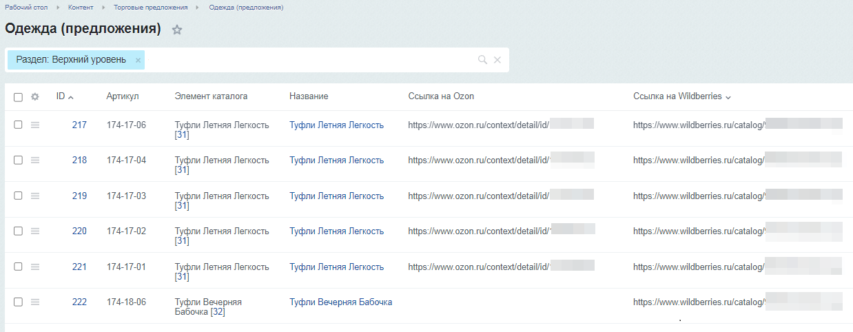 Для сопоставления товаров на сайте Озон и товаров/ТП в каталоге 1С-Битрикс модуль использует параметр Озон «Артикул». Необходимо, чтобы в инфоблоке было свойство, которое содержит данное значения для соответствующих товаров. Если его нет, то необходимо его создать и заполнить нужными значениями.