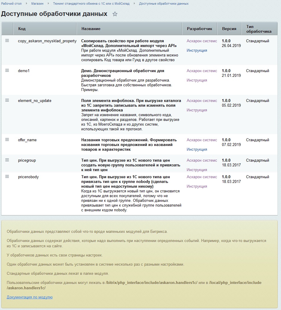 Магазин -> Тюнинг стандартного обмена с 1С или с МойСклад Доступные обработчики данных