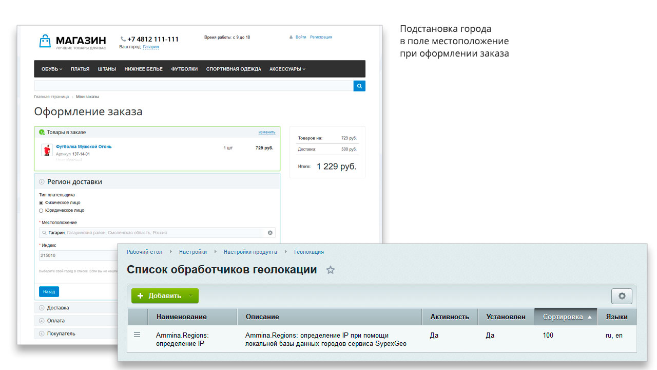 | | Подстановка региона в местоположение при оформлении заказа | | Привязка региона к заказу | |