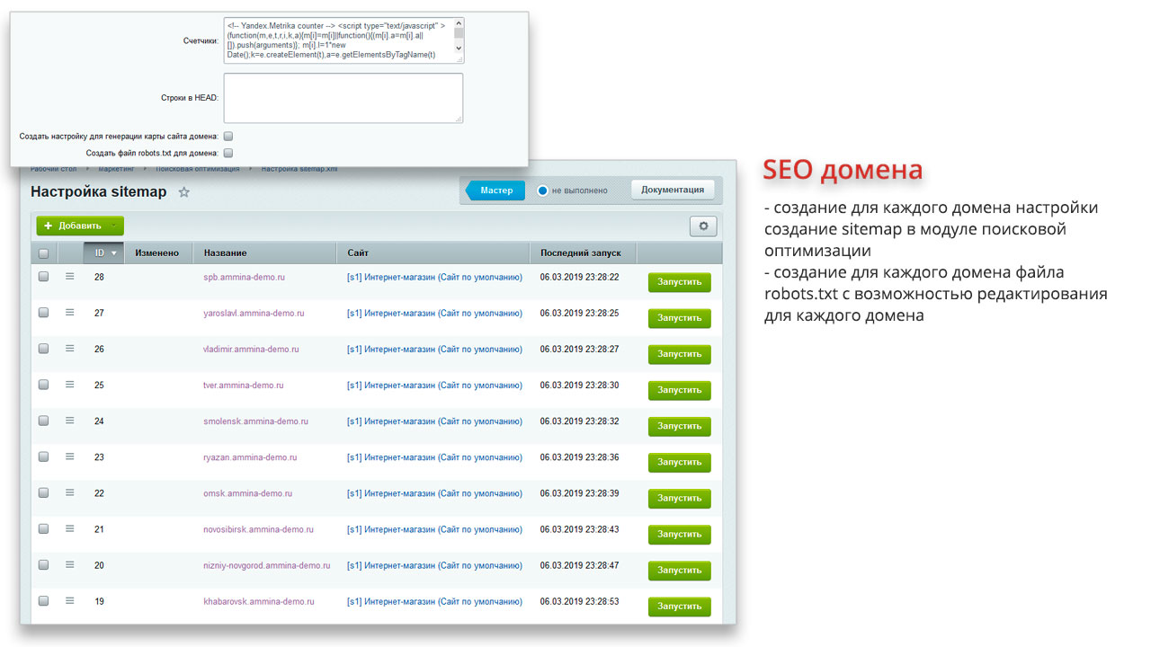 | | SEO-оптимизация регионов | | Карта сайта и robots.txt каждого домена | |