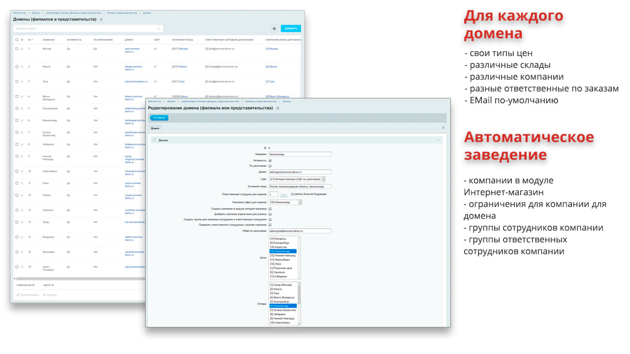 | | Вывод геозависимого контента Для каждого региона могут быть выведены собственные контактные данные, время работы и прочая информация. Так же данная информация может изменяться в зависимости от города/региона/страны пользователя, времени суток, дня недели, временного интервала, либо от любого условия, написанного на PHP | | Контент по регионам Модуль позволяет ограничить контент для каждого региона: новости, товары, статьи (элементы инфоблоков), категории товаров (разделы инфоблоков) и прочий контент (пользовательские свойства). |