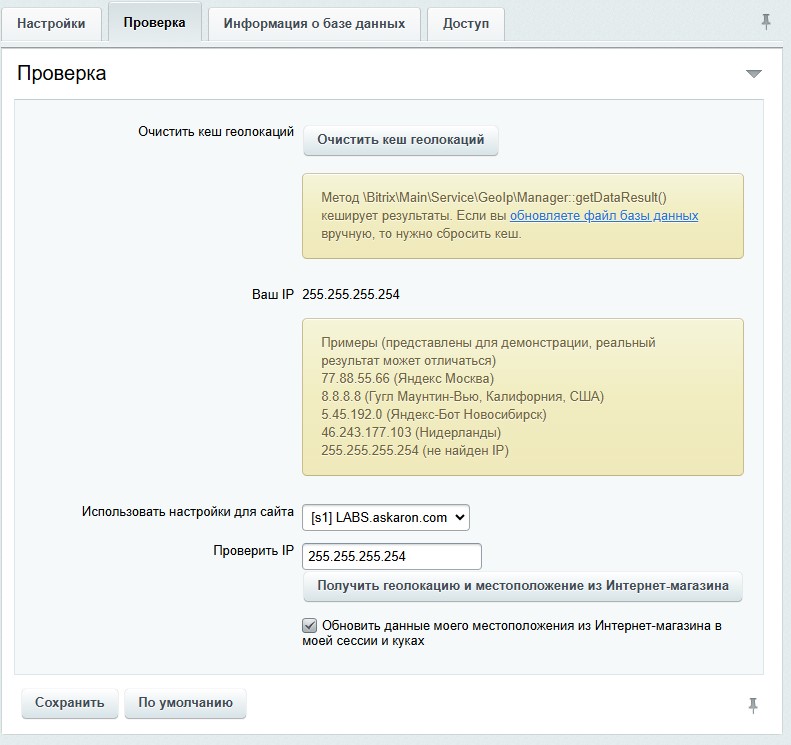 Настройки - Настройки продукта - Настройки модулей - Город по IP, определение местоположения для доставки