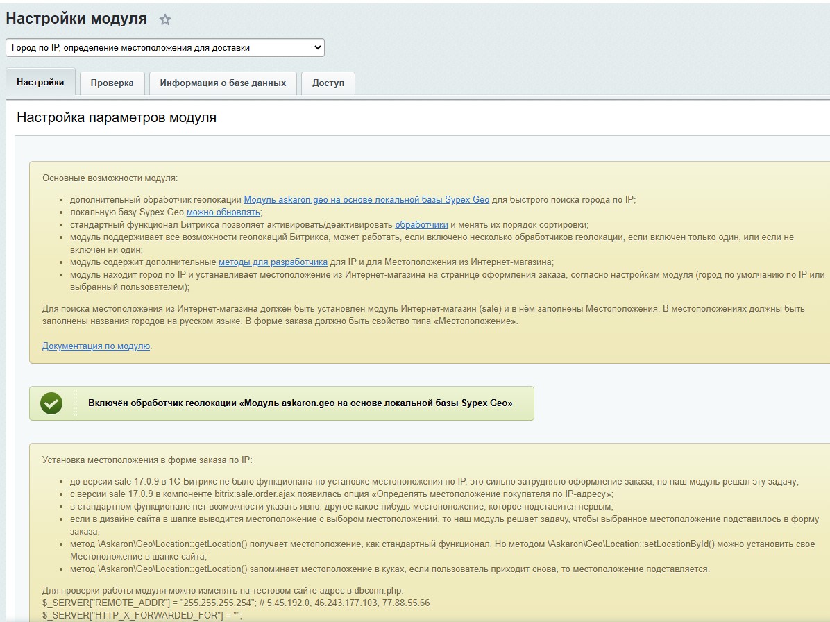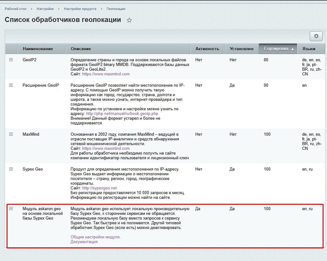 - дополнительный обработчик геолокации называется «Модуль askaron.geo на основе локальной базы Sypex Geo»;