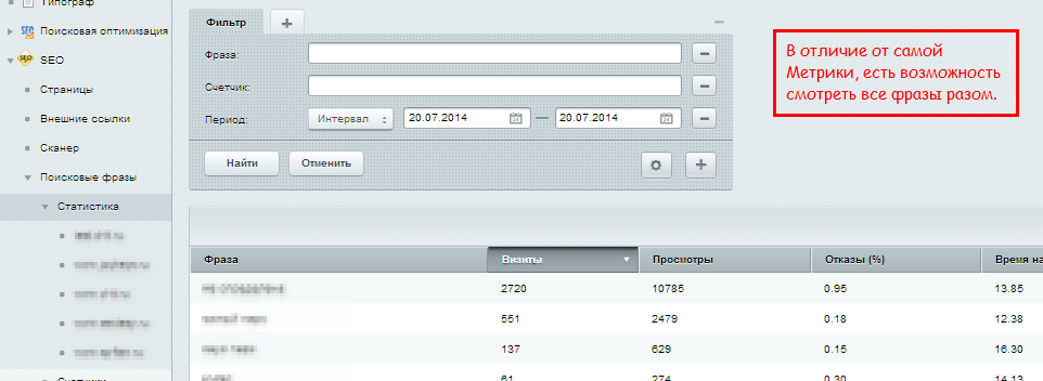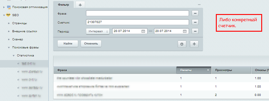 После установки модуля в глобальном меню "Сервисы" появится пункт "Поисковые фразы". Если у вас установлены SEO-инструменты, модуль будет внедрен внутри его меню.