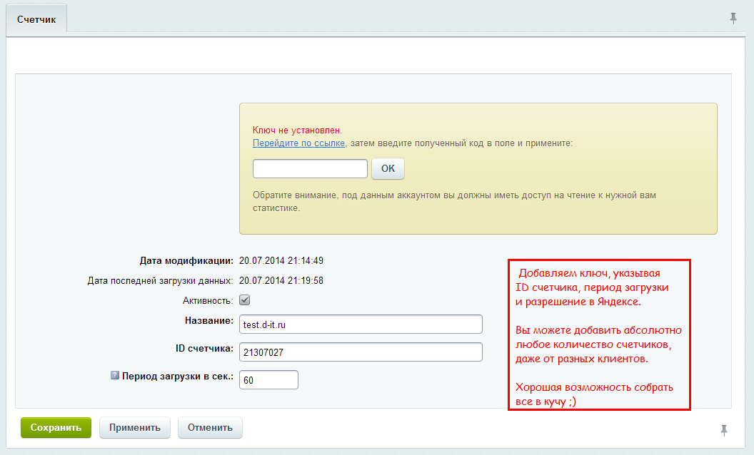 Внимание! Если вы меняете пароль в Яндексе для аккаунта, к которому привязывали счетчики, вам потребуется обновить ключи в модуле (в настройках счетчиков). К сожалению, это специфика технологии, применяемой Яндексом. По всем вопросам, пожалуйста, оставьте тикет.