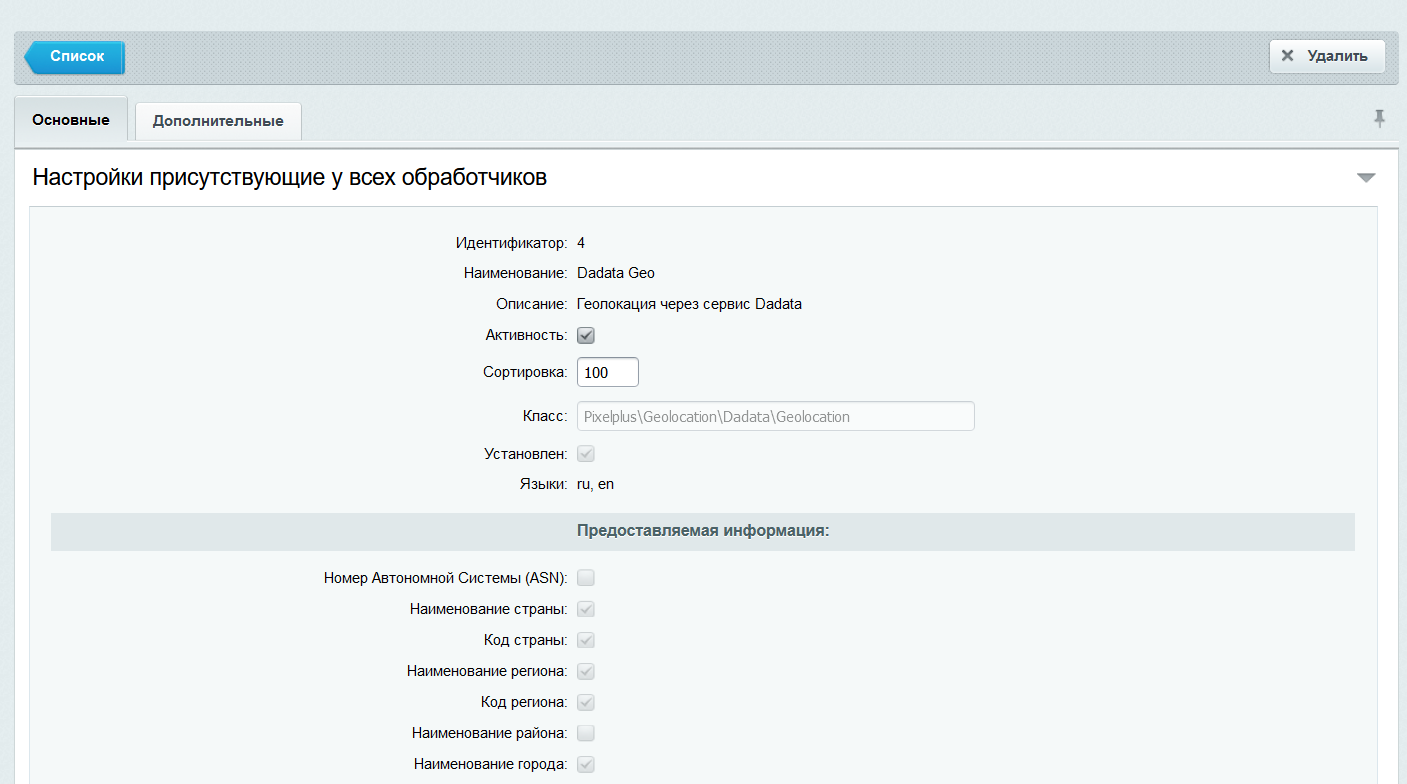 Модуль добавляет обработчик геолокации dadata.ru в стандартные обработчики геолокации Bitrix. Это позволит определять местоположение пользователя по IP (в том числе индекс).