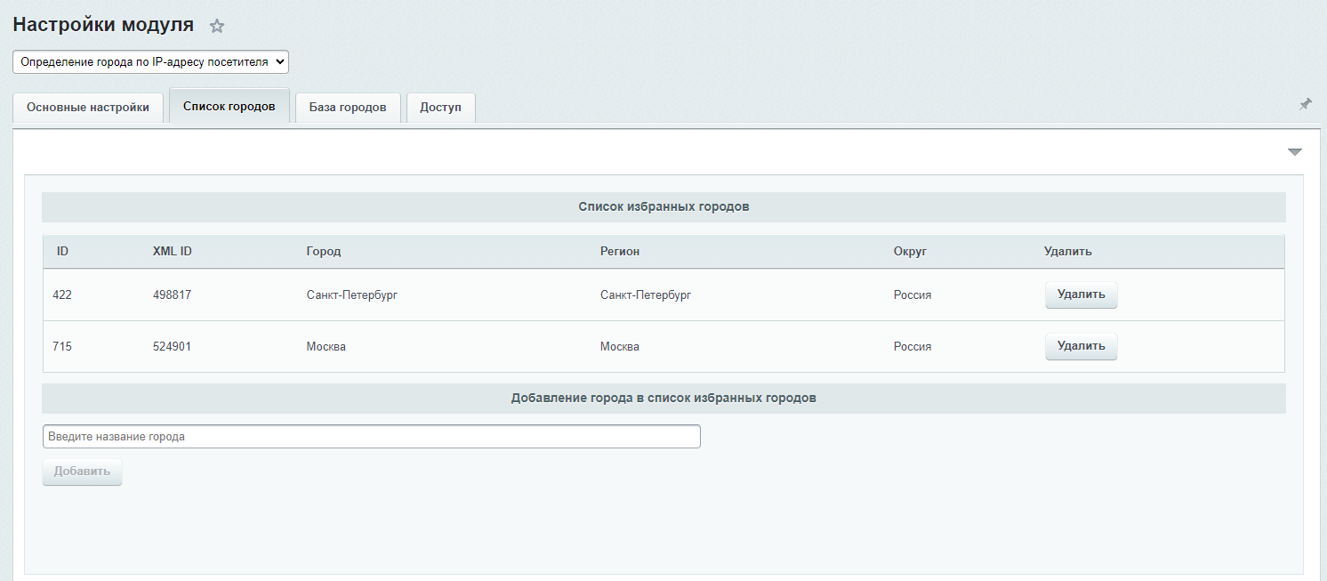 Локальные базы хранятся в Highload-блоках, что позволяет гибко настраивать города и привязку к ним.