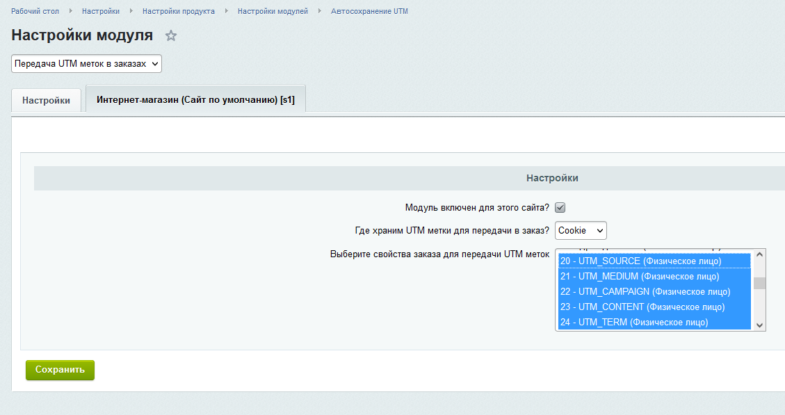 - В Свойствах заказа (Магазин - Свойства заказа - Список свойств) для каждого типа плательщика необходимо создать строковые служебные свойства для передачи UTM меток (продублируйте следующие значения в полях Название и Мнемонический код):