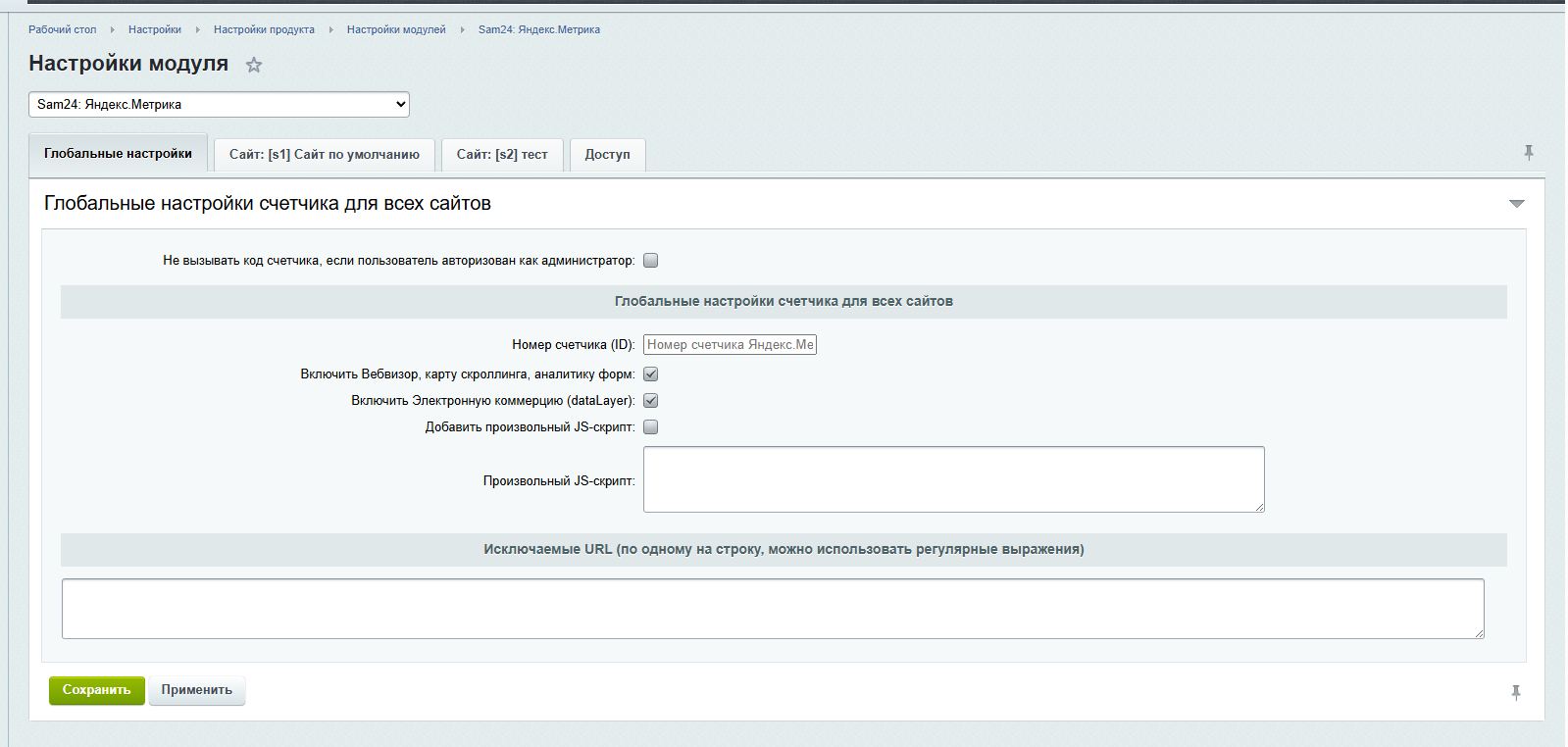 - Мультисайтовость: Отдельные настройки счетчика и подключаемых скриптов для каждого сайта. - Вебвизор: Включение записи поведения пользователей на сайте. - Электронная коммерция: Поддержка отслеживания электронной коммерции через dataLayer. - Исключение страниц: Гибкая настройка исключения определенных URL от отслеживания с поддержкой регулярных выражений. - Пропуск для администраторов: Опция отключения счетчика для авторизованных администраторов сайта. - Автоматическая вставка: Код счетчика добавляется автоматически через обработчик событий, без необходимости модификации шаблонов.