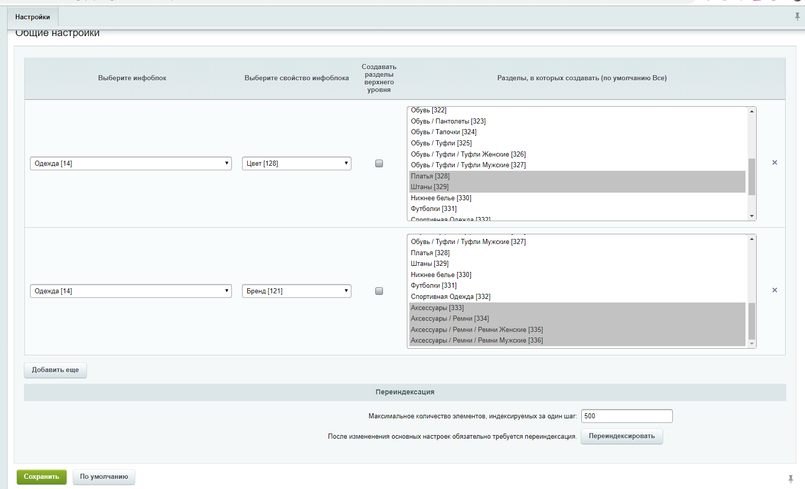 Настройки необходимо сохранить, после чего выполнить переиндексацию на этой же странице.