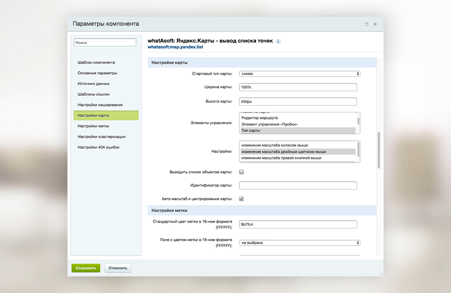 Затем необходимо указать в параметрах компонента желаемые настройки выбора отображаемых иконок http://whatasoft.net/images/bitrix/solutions/geoobjectsmap/pin-settings.jpg.