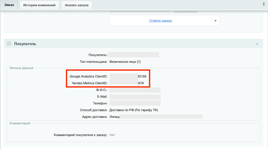 Модуль создает два свойства заказа и начинает сохранять в них id клиента Яндекс и Google.