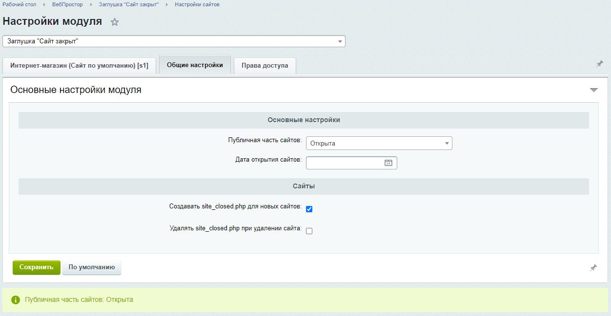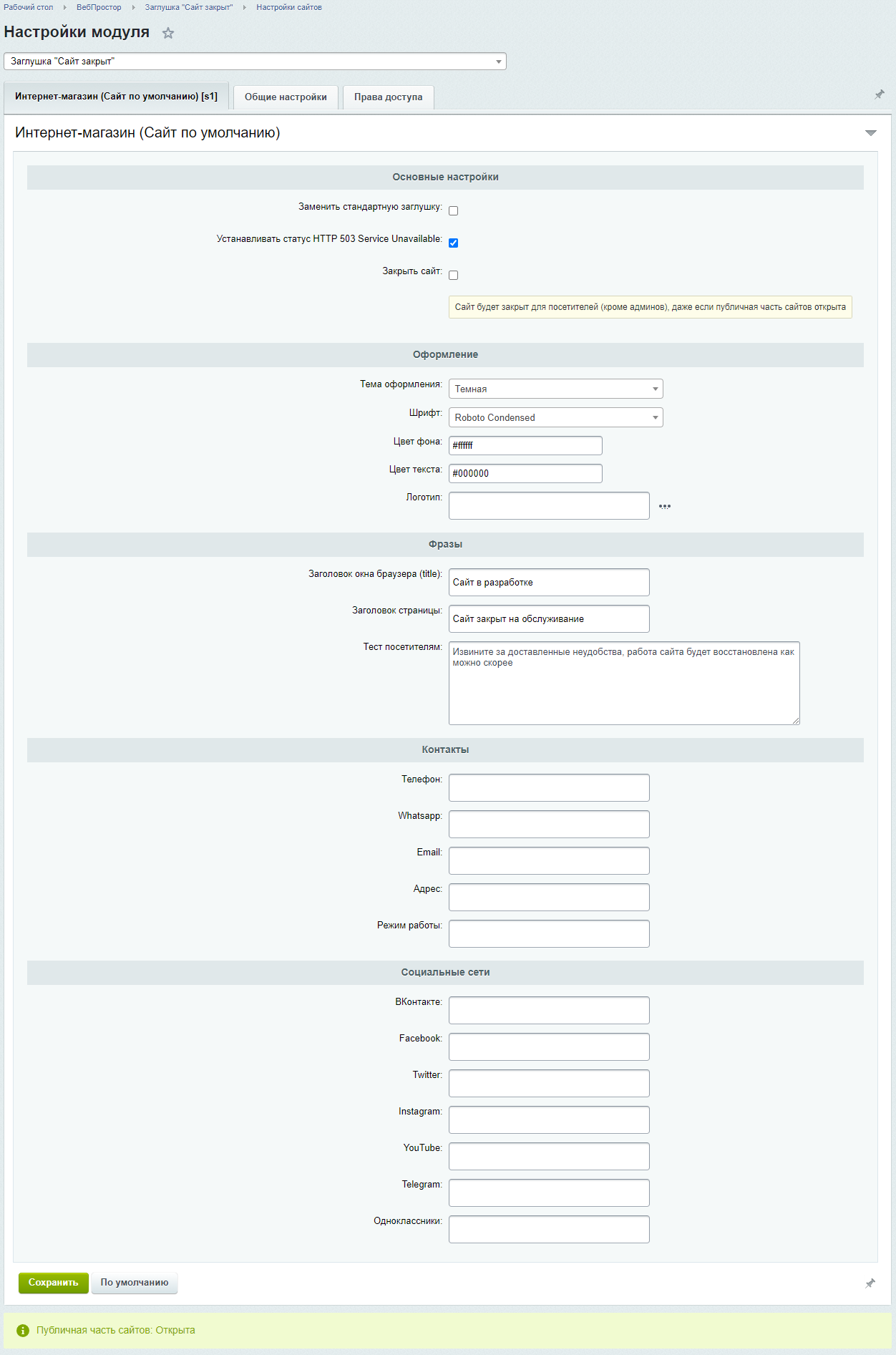 Поддержка многосайтовости - заглушка устанавливается индивидуально для каждого сайта. Можно отключить отдельный сайт, не закрывая при этом публичную часть сайтов.