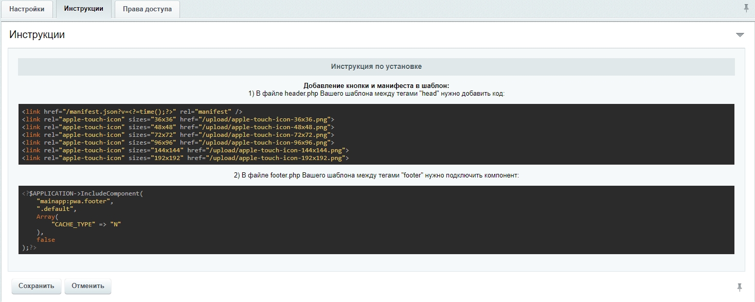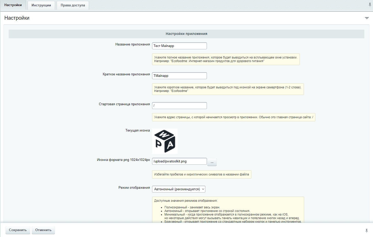 Настройки кнопки доступны через: Настройки - Настройки продукта - Настройки модулей - Mainapp. PWA приложение
