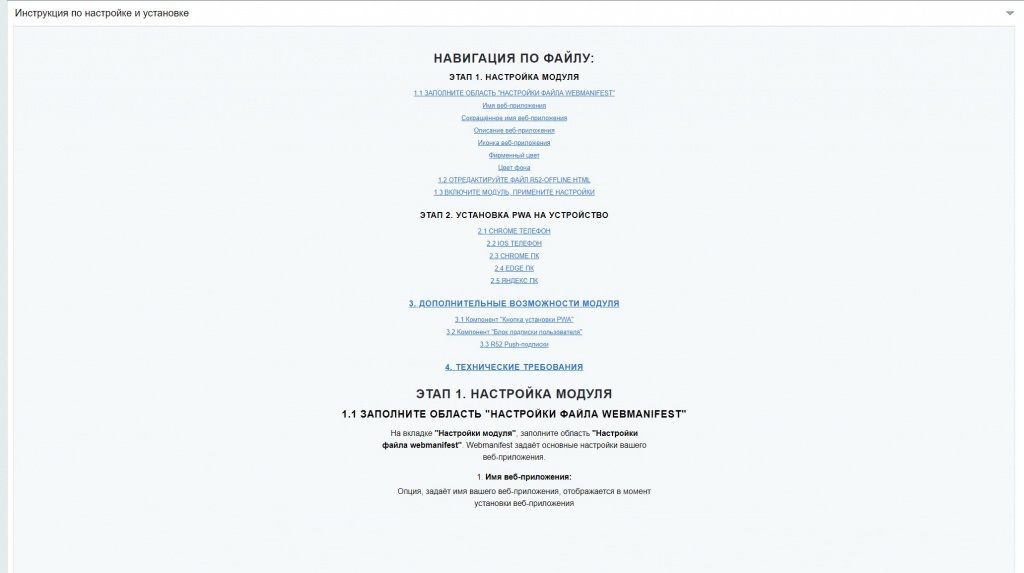 Модуль добавляет функционал, который в несколько простых кликов позволяет установить сайт как приложение на смартфон или ПК без привязки к интернет-браузеру. И для этого не нужно лезть в код сайта, необходимые ресурсы для веб-приложения генерируются автоматически.