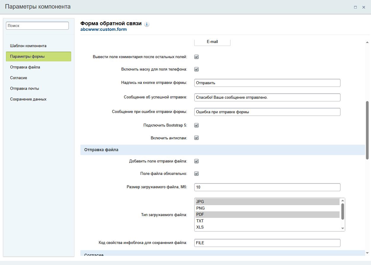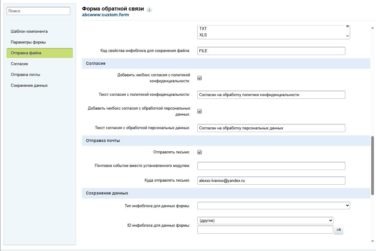 Сохранение данных формыДанные отправленной формы можно сохранить в инфоблок (выбирается в настройках), список отправленных полей сохраняется в поле "описание анонса", для сохранения отправленного файла в инфоблоке необходимо добавить свойство типа файл и указать его символьный код в настройке "Код свойства инфоблока для сохранения файла".