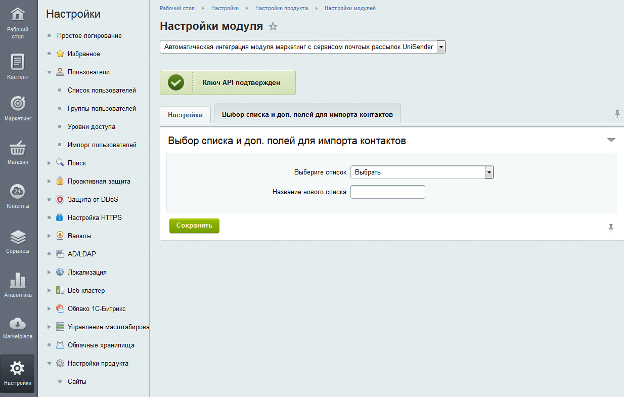Автоматическая интеграция модуля маркетинг с сервисом почтовых рассылок UniSender