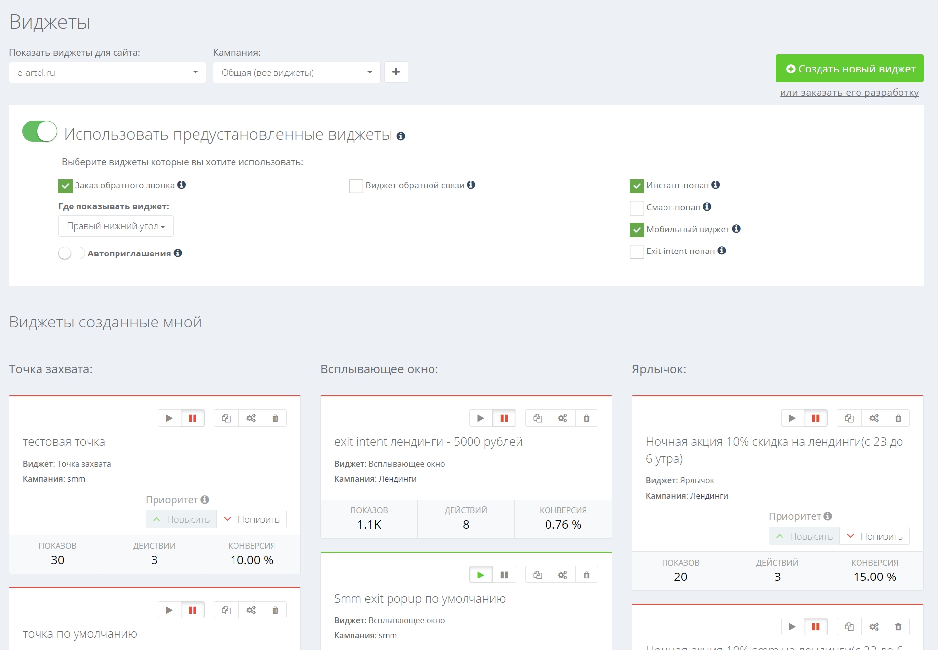 При этом, создать для отдельных товаров или групп товаров различные наборы виджетов, удобно организовав их по кампаниям.