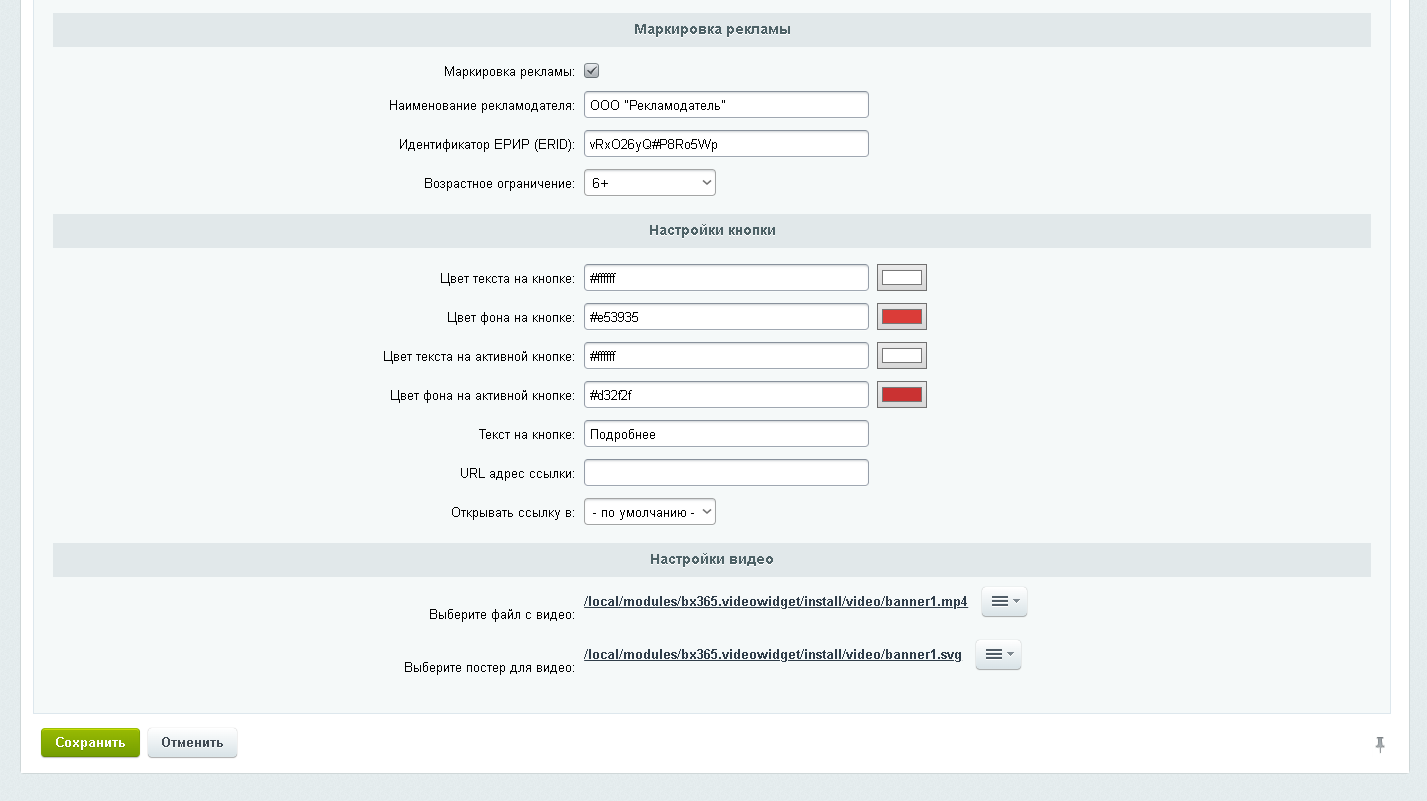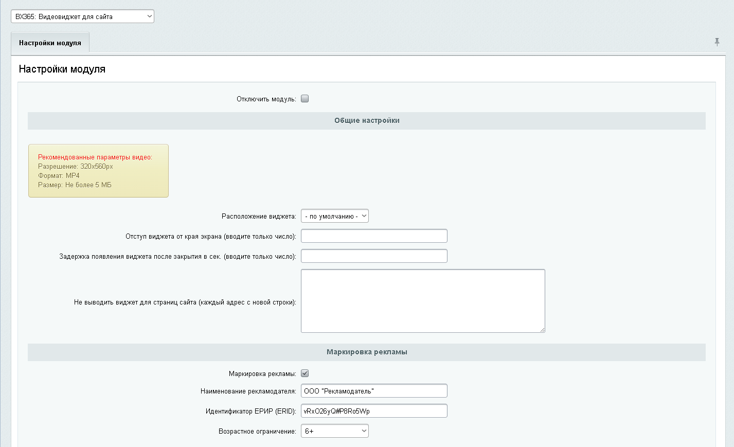 Включить маркировку рекламы - включает отображение блока с информацией о рекламодателе.
