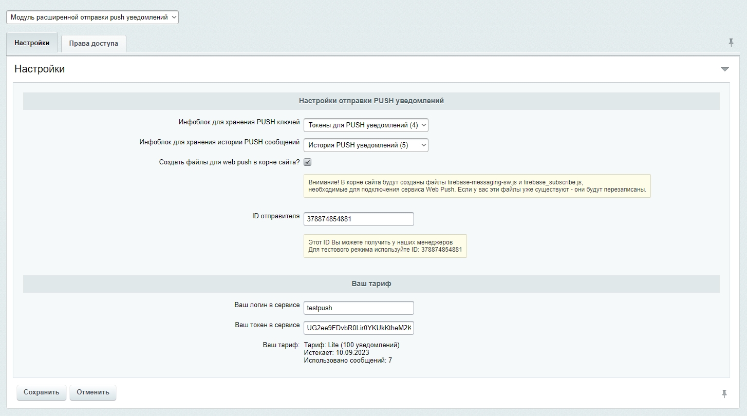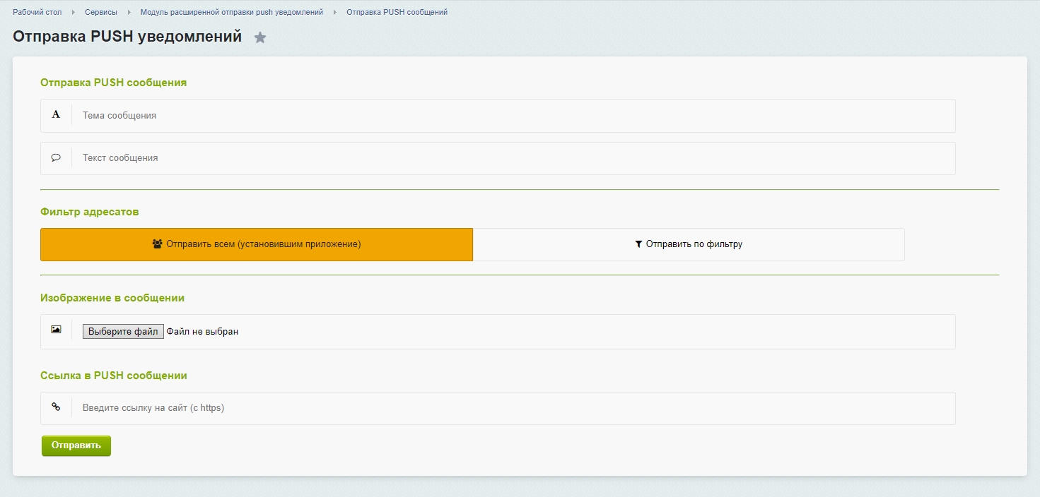 В отличии от большинства сервисов отправки PUSH-уведомлений, вы получите собственный модуль отправки, интегрированный в вашу панель управления сайтом на Битрикс. Все настройки и отправка происходят в вашей панели управления.