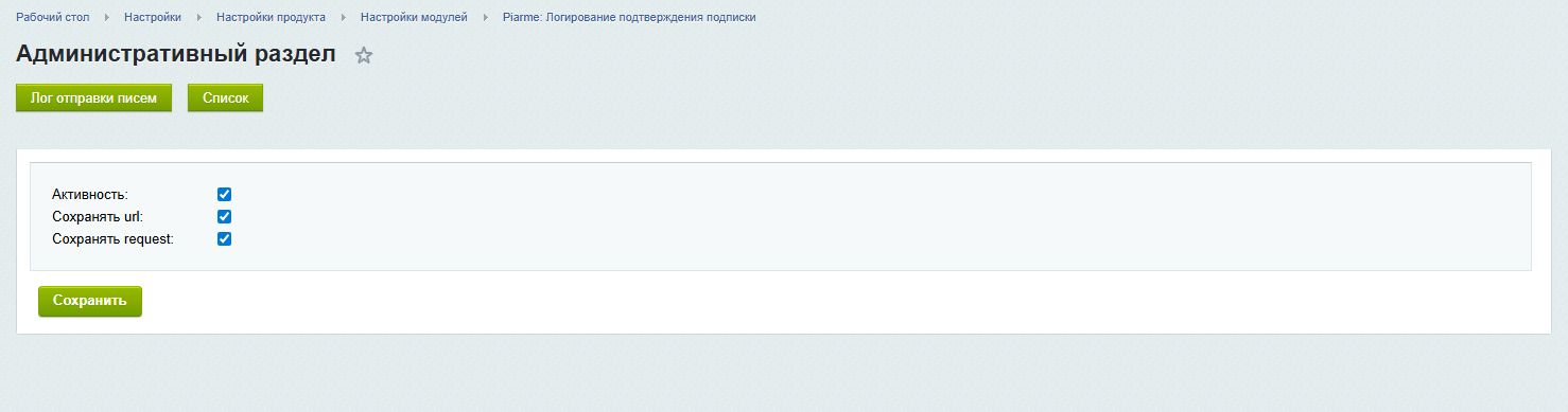 После этого перейдите в "Настройки модулей / Piarme: Логирование подтверждения подписки" и нажмите "настройки" для конфигурации модуля и просмотра списка подтверждений.