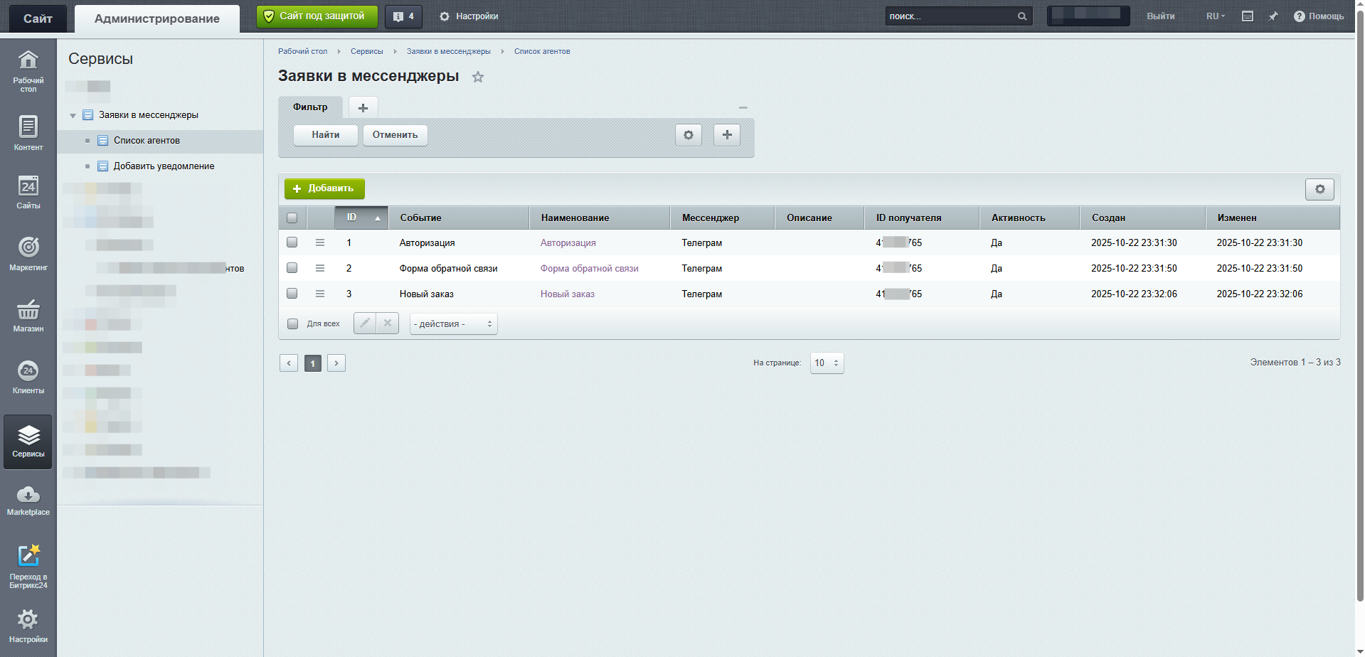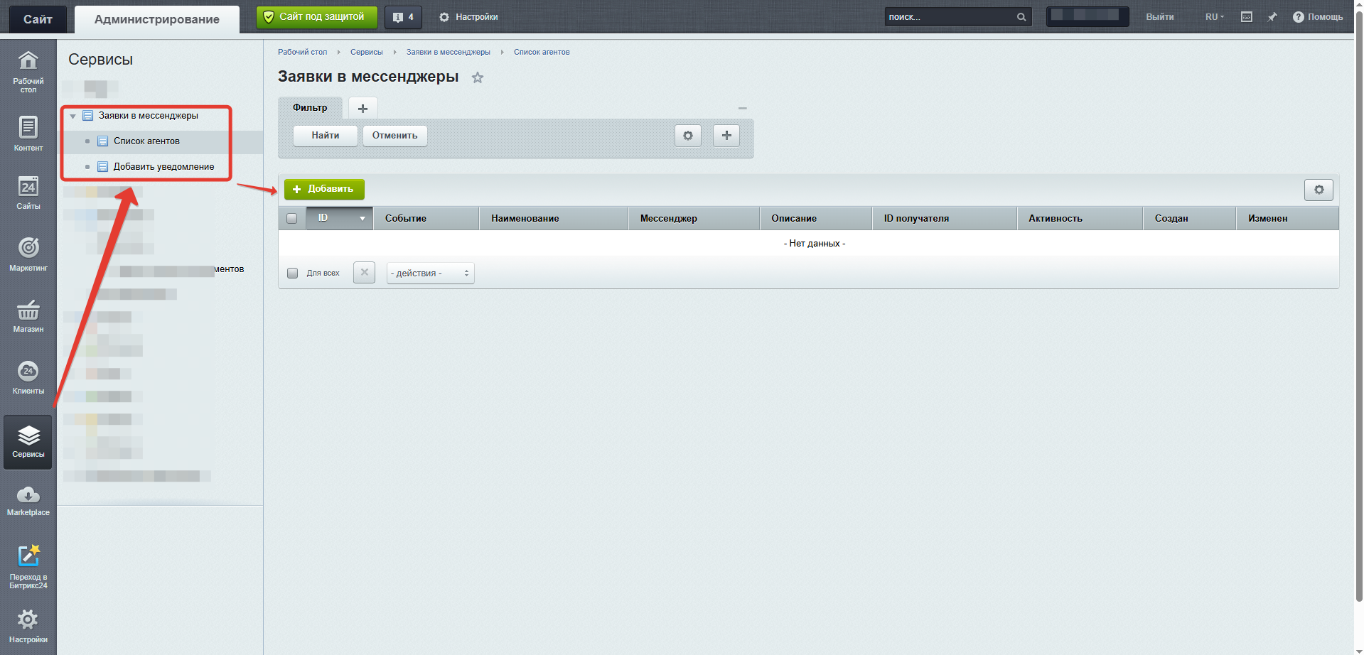 2. После того, как модуль установлен, перейдите на страницу настройки модуля Администрирование -> Сервисы -> Заявки в мессенджеры. В разделе Список агентов нажмите на кнопку Добавить