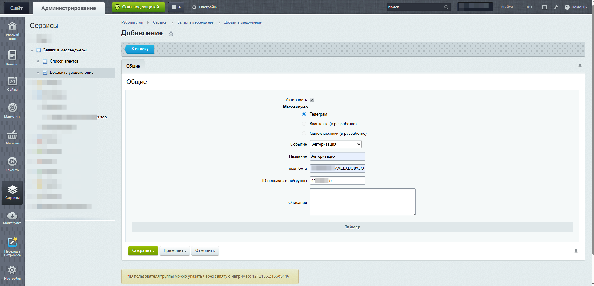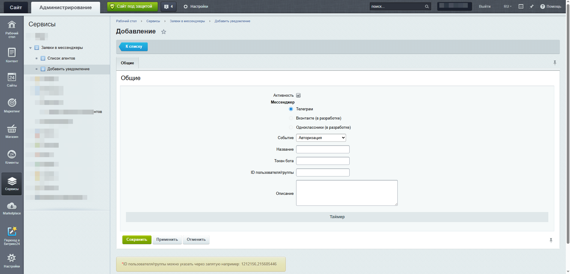 Модуль заявок в мессенджеры для сайта на Bitrix удобный инструмент интеграции взаимодействия пользователей с сайтом и популярных платформ мгновенных сообщений, таких как Telegram, Viber, OK, VK .