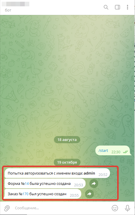 7. Телеграм бот обязательно нужно активировать, нажать start (старт) или же отправить вашему боту любое сообщение.